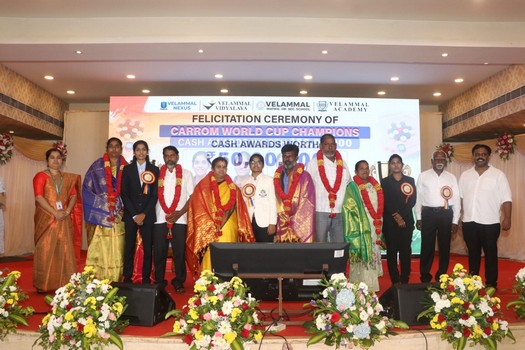 In a grand gesture of appreciation and encouragement, Velammal Nexus Group Correspondent Mr.MVM VELMOHAN proudly felicitated World Carrom Champions Ms. M. Khazima, Ms. V. Mithra, and Ms. K. Nagajothi for their exceptional achievements on the global stage. The felicitation ceremony, held today, highlighted the champions dedication, perseverance, and remarkable contributions to the sport of carrom.