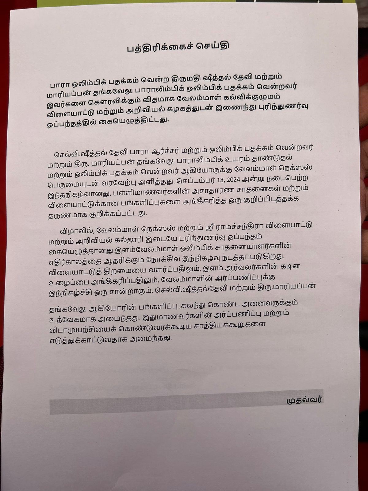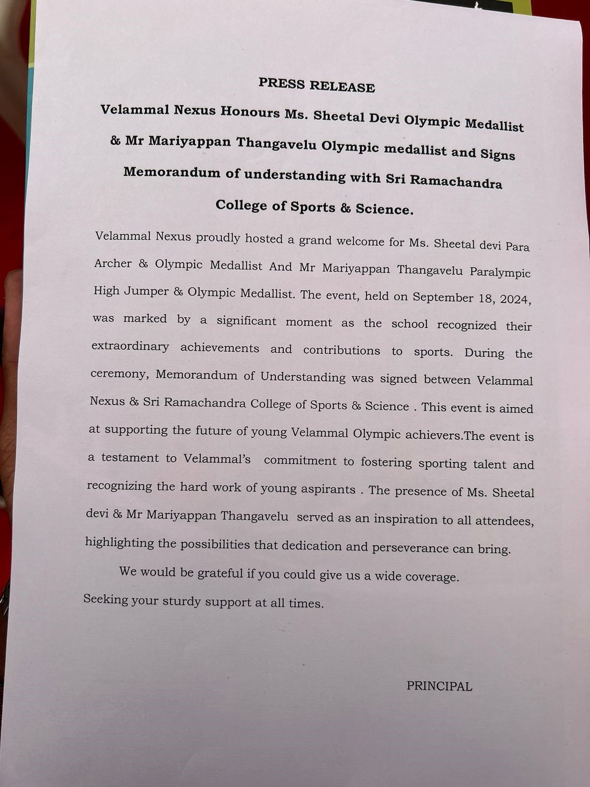 “Velammal Nexus” Honours Ms. Sheetal Devi & Mr. Mariyappan Thangavelu Olympic Medalist GeneralSports By Naveen On Sep 19, 2024 1,739 Share HonoursMr. Mariyappan ThangaveluMs. Sheetal DeviOlympic MedalistVellammal Nexus 1,739 Share