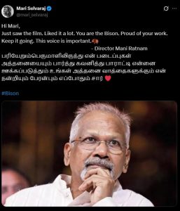 இந்நிலையில் இயக்குனர் மணிரத்னம் பைசன் படத்தை பார்த்துவிட்டு