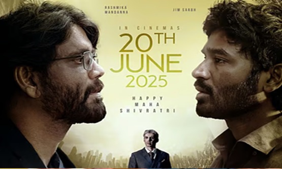 The release date poster showcases Nagarjuna and Dhanush with somber expressions, their eyes locked in an intense gaze, while Jim Sarbh stands in the background, exuding an air of power and mystery.