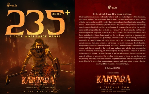 Hombale Films therefore makes a strong and sincere appeal to the public and audiences to refrain from any act that involves imitating, mimicking, or trivializing the Daiva personasβwhether in cinema halls or in public places.